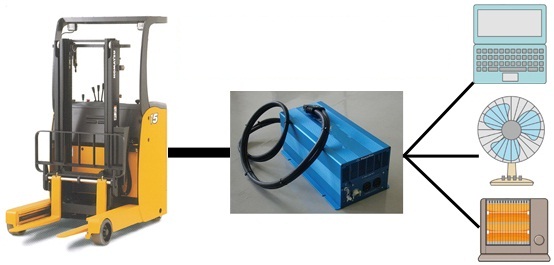 なんと!お客様がお使いのバッテリーフォークリフト(48V)につなぐだけでフォークリフトが補助電源装置に早代わり!!